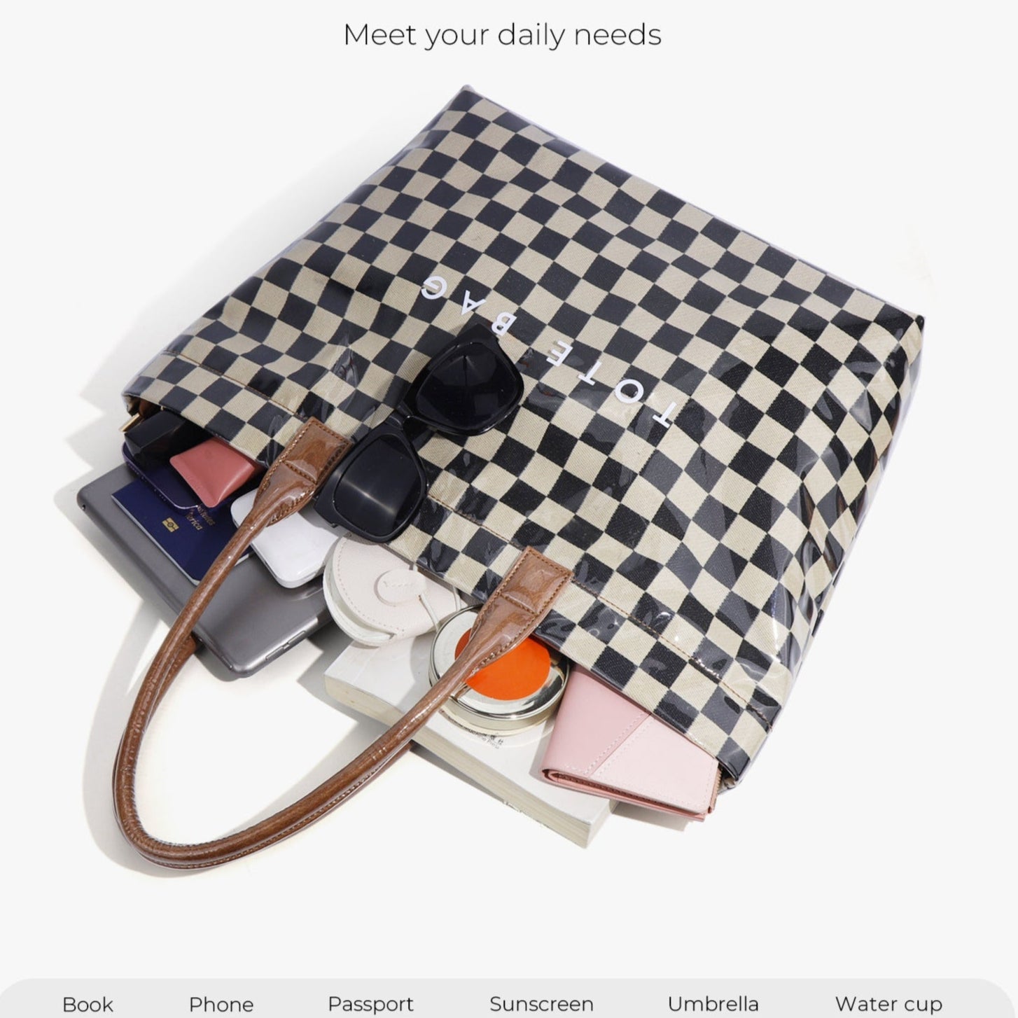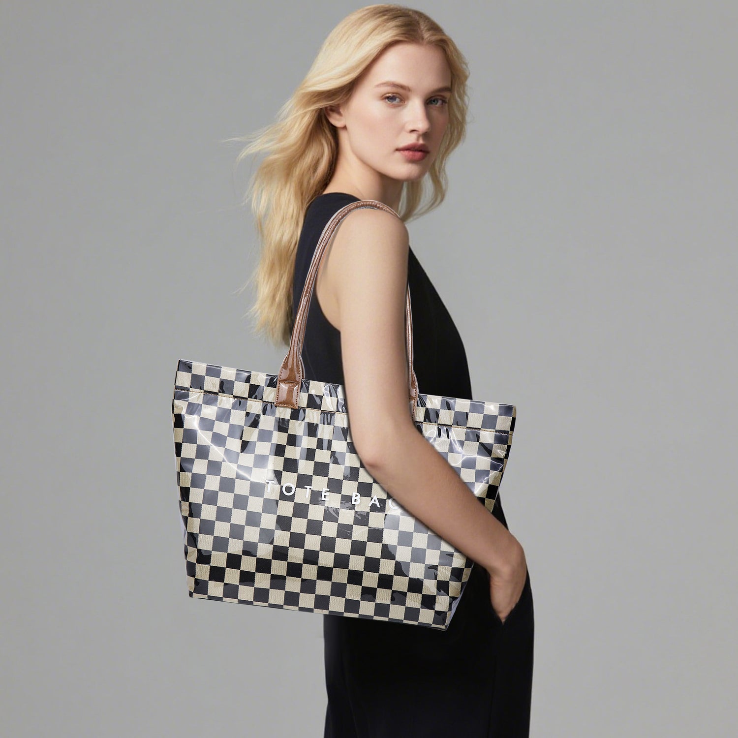 The Gloss Tote blends bold design with everyday practicality. Crafted from high-shine, water-resistant PVC, it’s lightweight yet durable — perfect for work, weekends, or travel. Featuring our signature checkered pattern and statement “Tote Bag” print, it’s as eye-catching as it is functional, offering plenty of room for your laptop, gym gear, or daily essentials.